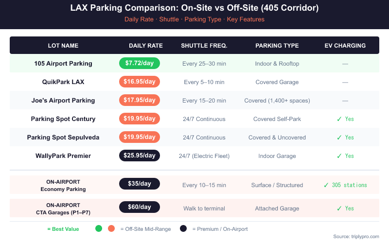 Off-site 405-corridor parking ranges from $7.72/day to $31.95/day based on current verified rates. On-airport parking ranges from $20/day (Budget Parking) to $75/day (Valet). Here's how costs stack up across a typical trip length.