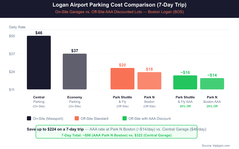- On-site comparison: Massport's Central Parking Garage charges up to $46/day; the Economy Parking Garage is cheaper at $37/day but still pricier than AAA-discounted off-site options.