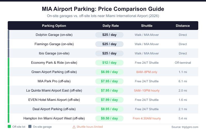 Airport parking in Miami FL ranges from $6.99/day at off-site lots to $25/day in on-site garages. Compare all MIA parking options, rates, shuttle details, and tips for 2026.