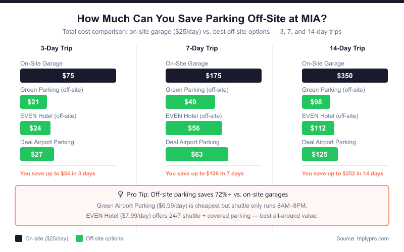 Long-term parking at MIA is available both on-site and off-site, and the cost difference is significant. On-site garages cap at $25/day with no long-term discount — a 7-day stay costs $175. The Economy Park & Ride at $12/day drops that same week to $84. Off-site lots push the savings even further — $6.99/day at Green Airport Parking works out to just $48.93 for a week.