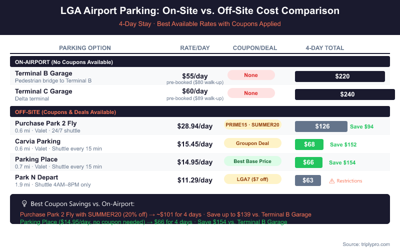 For a full breakdown of every active deal and how to stack them, see our LaGuardia airport parking deals guide, which covers Groupon, loyalty programs, and seasonal promotions in depth.