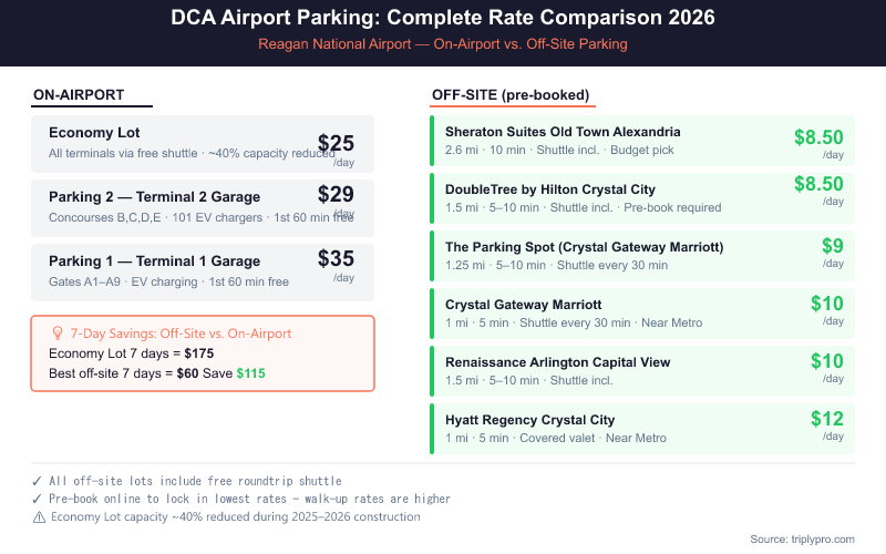 Airport parking near DCA ranges from $8.50/day at verified off-site hotel lots to $35/day in the Terminal 1 garage. The right choice depends on your airline, trip length, and flight time. With Economy Lot construction reducing capacity by ~40% right now, booking in advance is more important than ever.