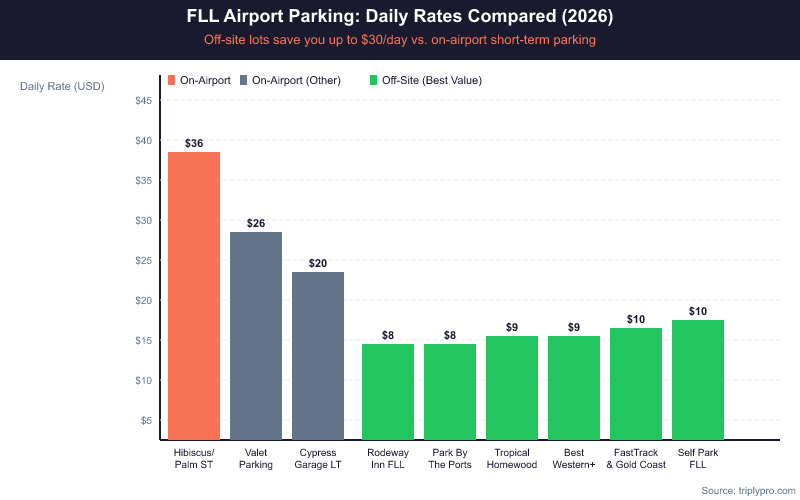 FLL parking costs range from $7.95/day at the cheapest off-site lot to $36/day for on-site short-term parking. The gap is significant for multi-day trips. A week in a short-term garage costs $252, while the same week at an off-site lot runs as little as $55.65.