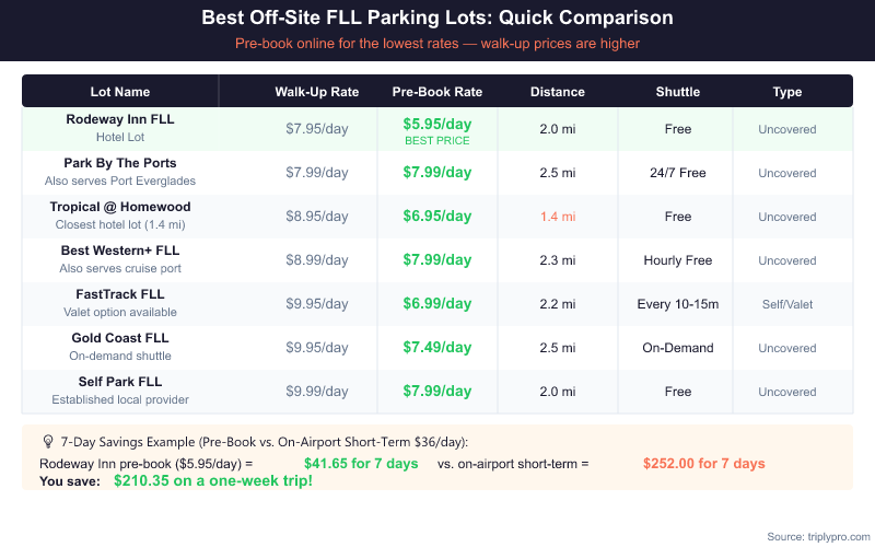 - Cheapest off-site option: Rodeway Inn & Suites FLL Airport Parking at $7.95/day with free shuttle