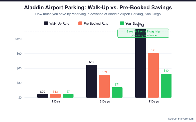 The standard walk-up rate at Aladdin Airport Parking is $20 per day. Pre-book through a platform like Airport Parking Reservations and that rate can drop to as low as $13/day (verified April 2026). Over a week, that difference adds up to real savings.