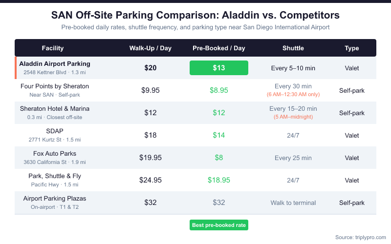 Compare Aladdin Airport Parking against other SAN off-site lots — rates from $13/day on Triply.