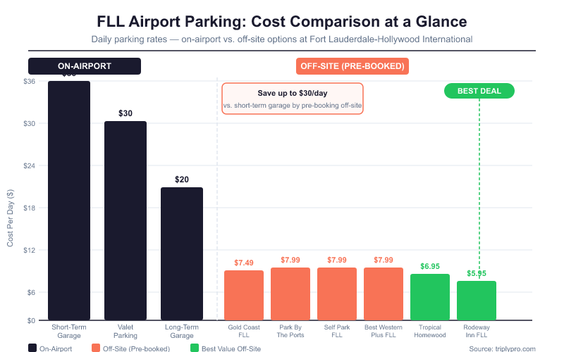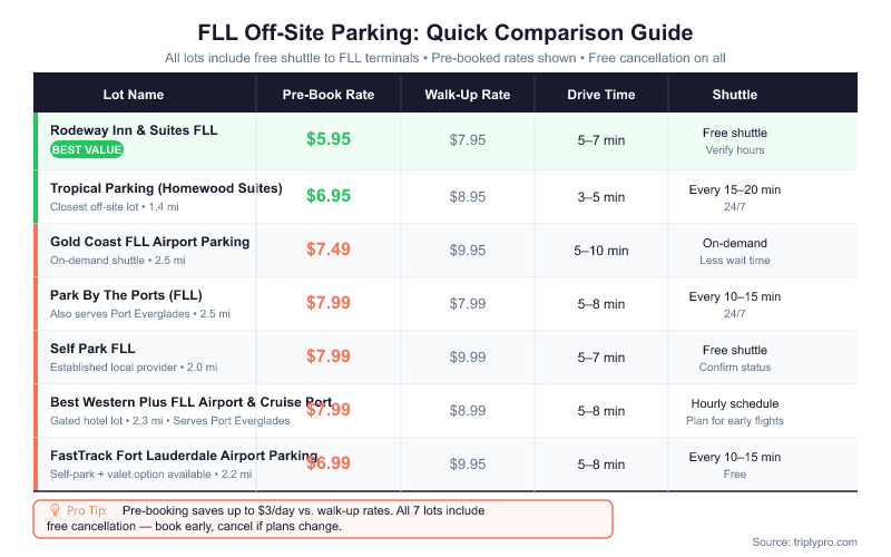 - Cheapest off-site lot: Rodeway Inn & Suites FLL Airport Parking at $7.95/day, with free shuttle and gated security.