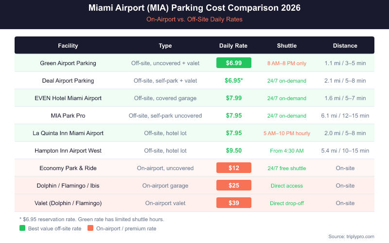 MIA parking rates range from $6.99/day at the cheapest verified off-site lot to $39/day for on-airport valet. The table below shows every confirmed option side by side (verified April 2026).