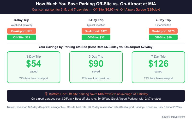 - 3-day trip: Off-site parking at $6.99/day = $20.97. Uber round trip from most Miami neighborhoods = $40–$80. Parking saves $20–$60.