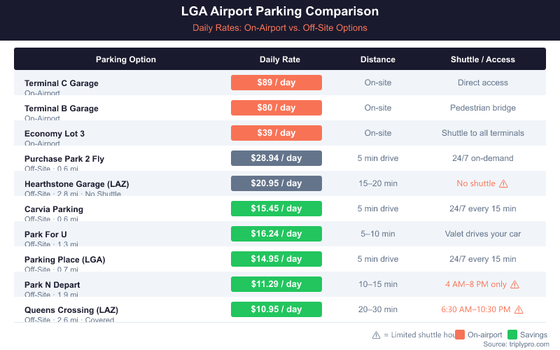 If you want to compare confirmed rates across all nearby lots right now, search verified LGA parking options on Triply — off-site lots start from $10.95/day.