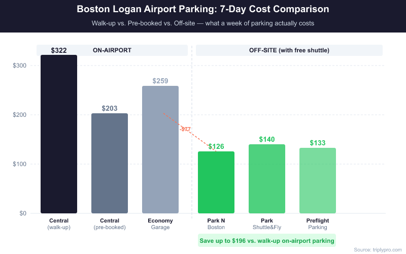 Pre-booking the Central Garage at $29/day brings the on-airport cost down to $203 for 7 days. That's still $77 more than Park N Boston — but you get direct terminal access with no shuttle. For business travelers or those with heavy luggage, that may be worth it.