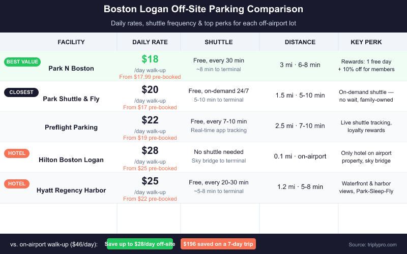 - Off-site lots (Park N Boston, Park Shuttle & Fly, etc.): $18–$20/day — free shuttles, 5–12 minutes to terminals. Best for trips of 3+ days.