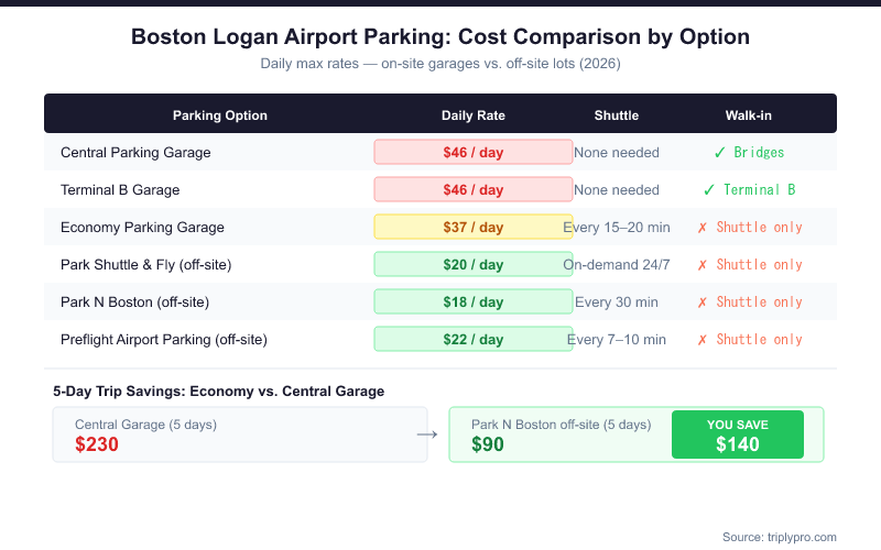 For a 5-day trip, parking at Park N Boston ($18/day) costs $90 total. The Central Garage costs $230 for the same period. That's a $140 difference — enough to cover a nice dinner or a checked bag fee on the way home. Off-site lots near Logan sit 5-12 minutes from the terminals with free shuttle service, so the tradeoff is minor for most travelers.