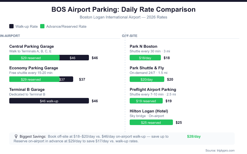 Off-site lots run $18–$28/day — that's up to 61% cheaper than the on-airport Central Garage's walk-up rate of $46/day. For long trips of 7+ days, the savings add up fast. A week at Park N Boston at $18/day costs $126 total versus $322 at the Central Garage.