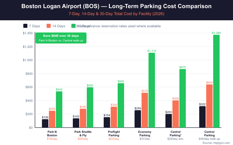 Boston Logan long-term parking cost ranges from $18/day at Park N Boston to $46/day at the Central Parking Garage. For most travelers on trips of 5 days or more, off-site parking saves $100–$800+ depending on trip length. The shuttle ride is a small trade-off for significant savings.