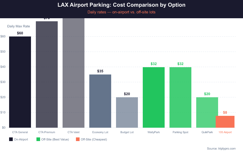 Off-site lots near LAX can save you up to 87% compared to on-airport valet rates. Every verified lot below includes a free 24/7 shuttle to all LAX terminals. Based on current Triply rates (verified April 2026):
