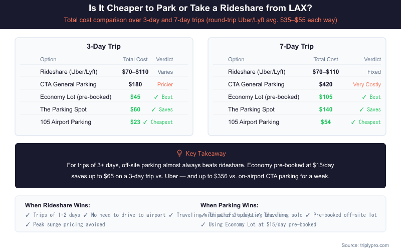 For trips of three days or longer, parking almost always beats rideshare. Here's a real-cost breakdown based on current rates and typical LAX rideshare pricing from a mid-distance LA neighborhood.