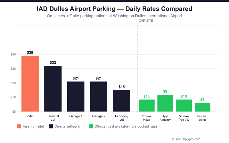 IAD parking rates range from $15/day in the Economy Lot to $39/day for valet — a spread of more than 2.5x. Off-site hotel lots bring the floor down to around $5.75/day with a coupon through comparison sites. Here's a full side-by-side comparison (verified April 2026):