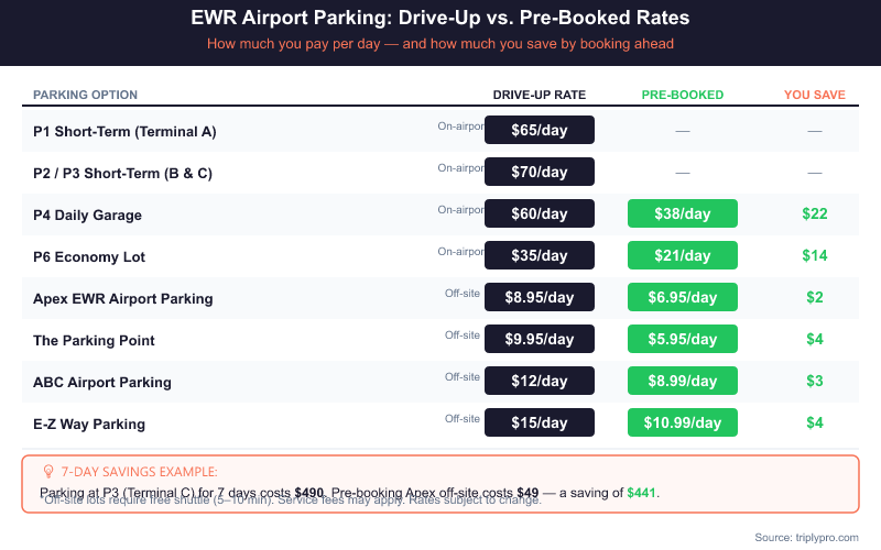 EWR parking costs vary widely depending on whether you park on or off the airport, and whether you pre-book. Here is a full breakdown of current rates (verified April 2026).