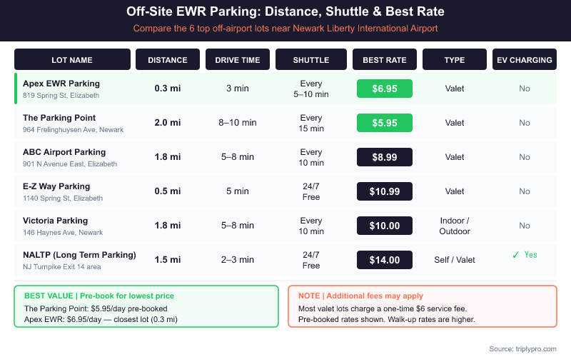 - Cheapest off-site option: Apex EWR Airport Parking from $8.95/day, with a free shuttle every 5–10 minutes to all terminals.