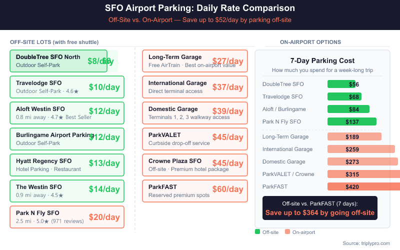 For a 7-day trip, parking at the DoubleTree SFO North Bayfront costs $56 total. The same trip in the on-airport Domestic Garage costs $273. That's a saving of over $200 — just by parking a short shuttle ride away. If you want a full breakdown by trip length, our guide to San Francisco airport long-term parking prices covers 3-day, 5-day, 7-day, and 14-day scenarios in detail.