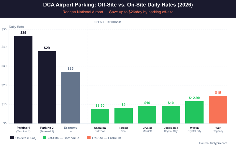 | DCA Economy Lot (on-airport) | On-site (surface lot) | $25/day | On-site | Free (on-site shuttle) |