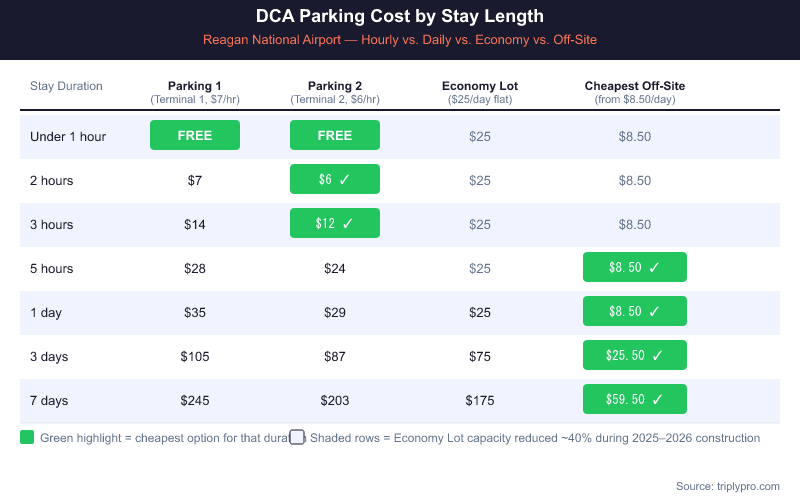 For the best combination of price and convenience on longer trips, compare all available DCA parking options on Triply — off-site lots near Reagan National start at $8.50/day with free shuttle service included.
