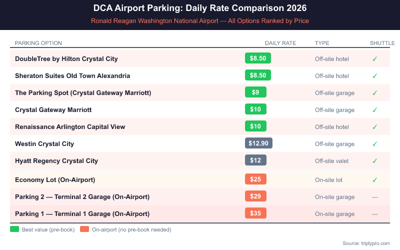 DCA airport parking cost per day is the daily rate you pay to park your car at or near Ronald Reagan Washington National Airport — ranging from $8.50/day at off-site hotel lots to $35/day in the on-airport Terminal 1 garage (verified April 2026). Three on-site lots are operated by the Metropolitan Washington Airports Authority (MWAA), while a growing number of nearby Crystal City and Pentagon City hotels offer lower-cost parking with free shuttles to the terminal.