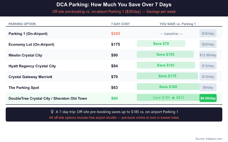 DCA airport parking costs $8.50–$35/day depending on lot and booking method. Compare on-site garages, Economy Lot, and off-site hotel parking options near Reagan National Airport.