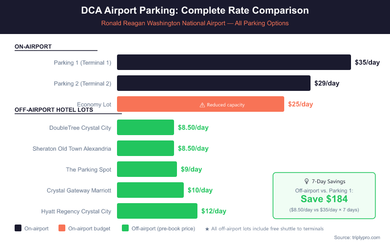 DCA airport parking daily rates range from $25/day at the on-airport Economy Lot to $35/day at Parking 1 (Terminal 1 Garage). Off-airport hotel lots near Ronald Reagan Washington National Airport start at just $8.50/day — saving you up to 66% versus on-site garage rates. With the Economy Lot currently running at reduced capacity due to active construction, knowing your options before you drive is more important than ever.