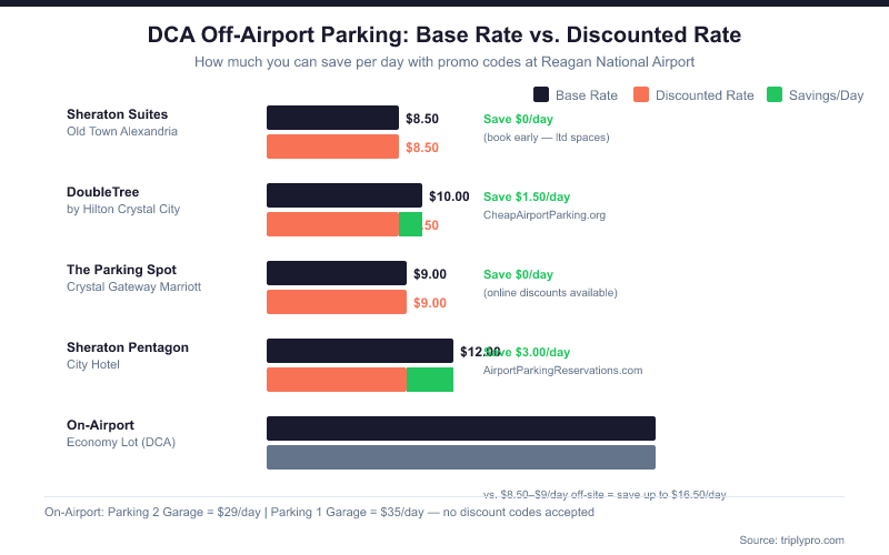 On-airport parking at DCA has no discount codes — what you see on the MWAA parking page is what you pay. Off-airport lots are where discounts actually happen.