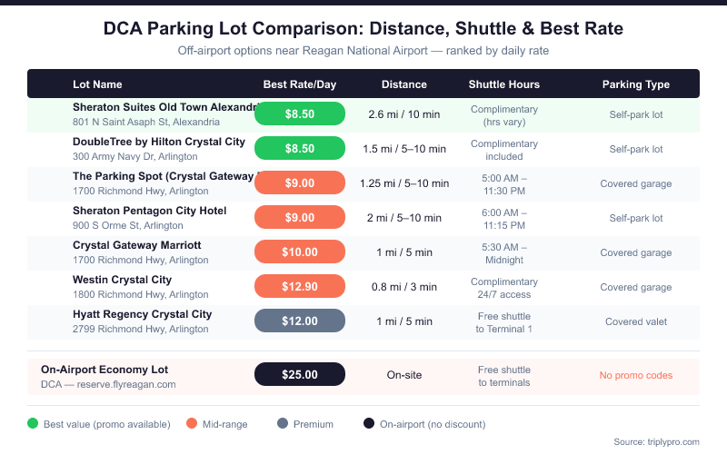 The Westin Crystal City is worth highlighting — at just 3 minutes from DCA, it's the closest off-site option and offers on-demand shuttle service. You don't need a hotel reservation to park there. For a deeper look at that property, see our article on Westin Crystal City DCA parking rates and shuttle details.