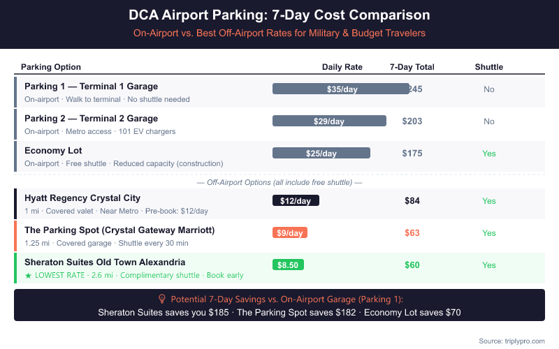 - Off-airport hotel lots start at $8.50/day — the best military-friendly rates near DCA come from pre-booking through third-party platforms.