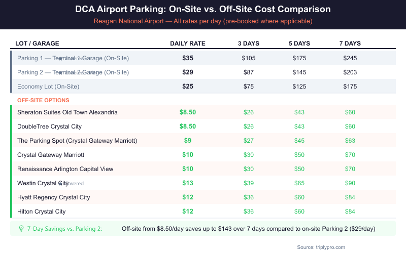 Off-site lots near DCA run $8.50–$15/day. The table below shows exactly what you'd pay at each lot for common trip lengths — data you won't find anywhere else in one place.