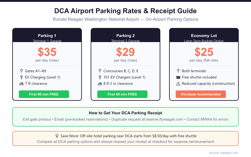 A DCA airport parking receipt is the official record of your parking transaction at Ronald Reagan Washington National Airport — issued at the exit gate, by email for pre-reserved bookings, or on request for duplicate copies. Most travelers receive one automatically when they pay and exit. If you need a duplicate for a business expense report or tax record, you can request one through the airport's parking office.