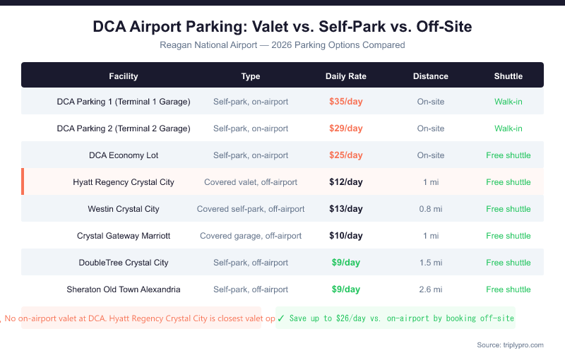 - Off-airport valet is available at the Hyatt Regency Crystal City for $15/day (pre-book online for $12/day) — the only verified off-site lot near DCA with covered valet included.