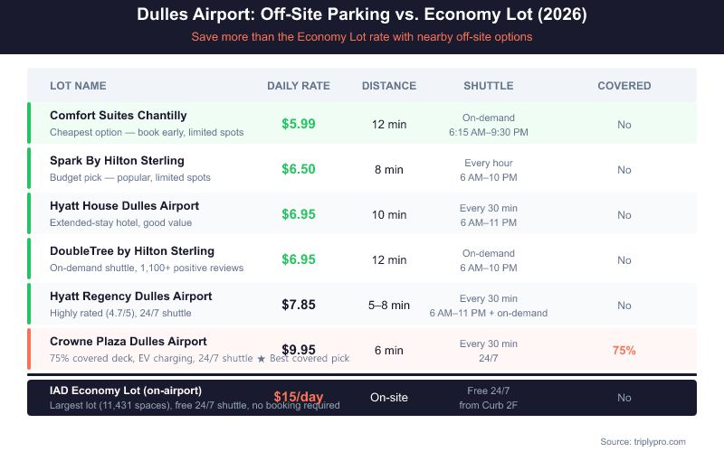 If you want to compare the Economy Lot against off-site options before deciding, you can also check rates across multiple providers at once. Compare IAD parking options — Economy Lot and off-site lots starting at $5.99/day — on Triply.