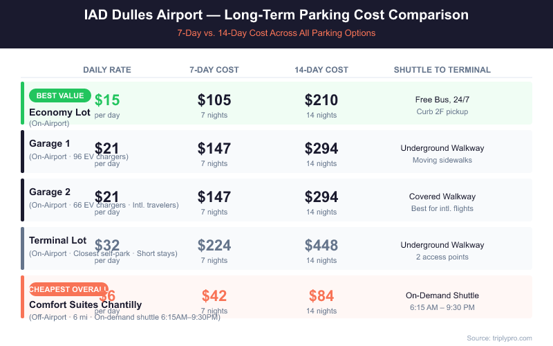 Yes — off-airport hotel lots near IAD are significantly cheaper than the Economy Lot for extended stays. Based on current verified rates, all seven tracked off-airport lots beat the Economy Lot's $15/day price. Here's what's available: