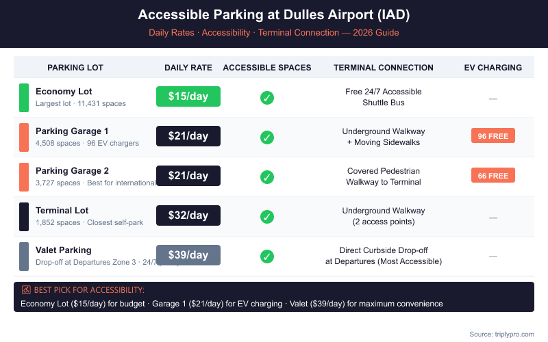The Economy Lot at $15/day is the most affordable option with accessible spaces. Choosing Economy over the Terminal Lot saves you $17 per day — that's a 53% saving for a week-long trip. The trade-off is the shuttle ride. For travelers with mobility devices who prefer a shorter walk after parking, Garage 1 or Garage 2 at $21/day offer covered walkways directly to the Terminal without a shuttle. For a full breakdown of all IAD parking costs, see our Dulles Airport parking rates comparison.