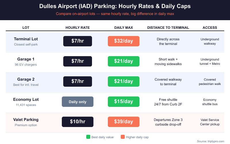 Before diving into the details, here's a quick comparison of every IAD hourly and daily parking option side by side. Compare IAD parking rates starting at $7/hour on Triply — find the best Dulles lot for your trip in seconds.