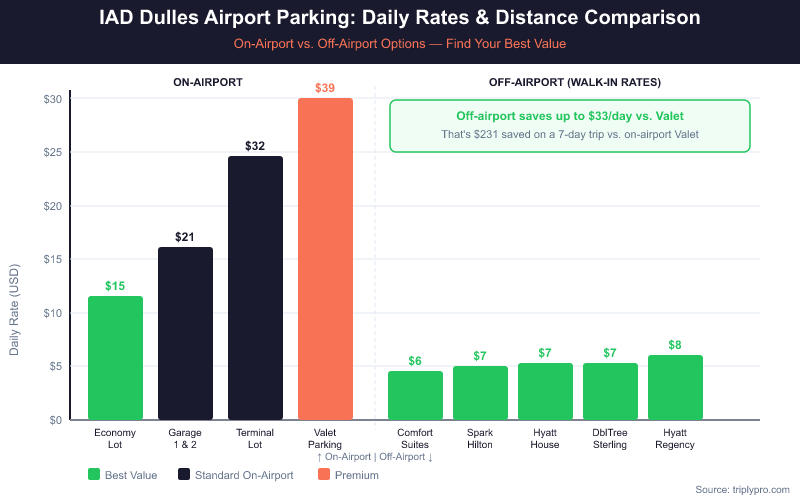 Off-site lots near IAD consistently beat on-airport prices, especially for stays of three days or longer. All seven verified off-site lots include free shuttle service to the terminal.