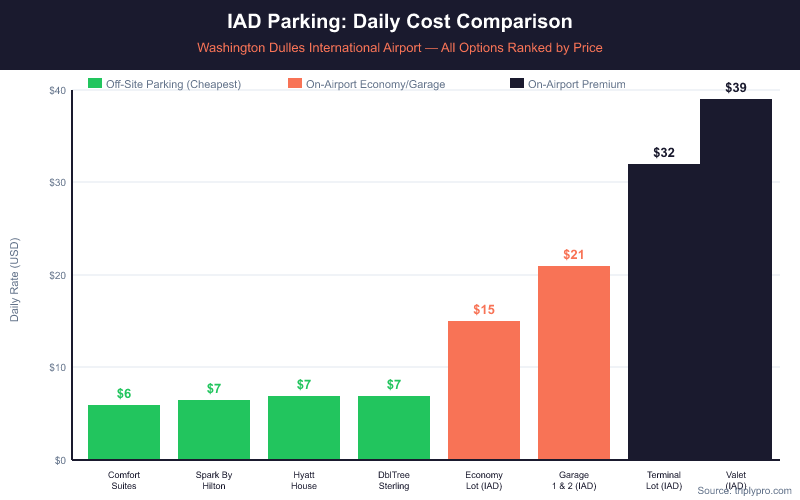 Parking costs at and near IAD vary widely — from $5.99/day at the cheapest off-site hotel lot to $39/day for on-airport valet. The table below compares every verified option, including the Metro park-and-ride strategy, so you can see total trip costs at a glance.