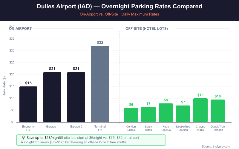 Dulles Airport overnight parking costs $15–$39/day on-airport. Off-site hotel lots start at $5.75/night. Here's every rate, shuttle schedule, and money-saving tip for IAD overnight parkers.