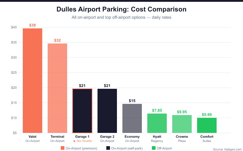 Compared to off-airport lots, Garage 1 costs up to 71% more per day than the cheapest verified alternative. For a 7-day trip, that's roughly $147 in the garage versus as little as $42 at the Comfort Suites Chantilly. The full Dulles Airport Parking Rates comparison covers every option in detail, including reserved rate tiers.