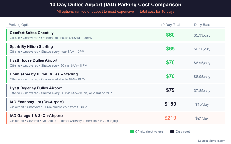 Dulles airport parking for 10 days ranges from $59.90 at off-site hotel lots to $150 at the on-airport Economy Lot and up to $390 for valet. Compare every verified IAD option with exact 10-day totals.