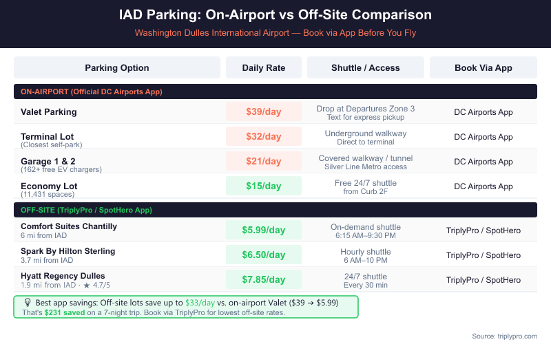 Third-party apps like SpotHero and TriplyPro are better if your priority is price. Off-site hotel parking near IAD runs $5.99–$9.95/day (verified April 2026), compared to $15–$39/day for on-airport options. That's a potential saving of more than $100 on a 7-day trip when you book off-site through a comparison app.