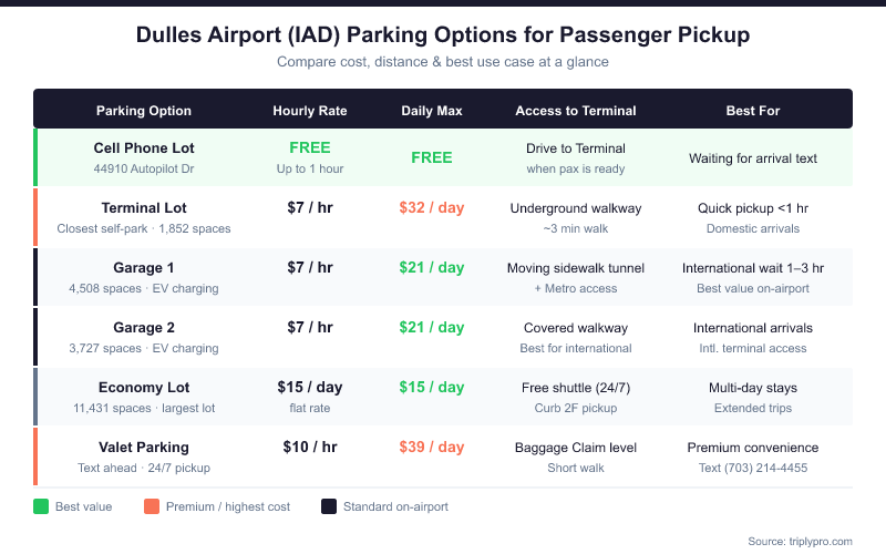 Dulles airport parking for arrivals is the process of choosing where to park — or wait — when picking up a passenger landing at Washington Dulles International Airport (IAD). The right choice depends on how long you wait, whether the flight is domestic or international, and how much you want to spend. The free Cell Phone Lot is best for short waits. The Terminal Lot at $7/hour (max $32/day) works well for quick entry and pickup. Parking Garages 1 and 2 cap at $21/day and connect directly to the terminal via underground walkway.