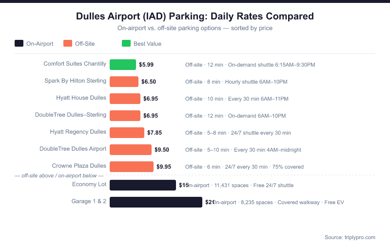 For a week-long trip, the difference between the Economy Lot ($105 total) and the Comfort Suites Chantilly ($41.93 total) is more than $63. That's real money. Our full Dulles Airport long-term parking guide breaks down exactly which lots win for multi-day trips and what to look for in shuttle reliability.