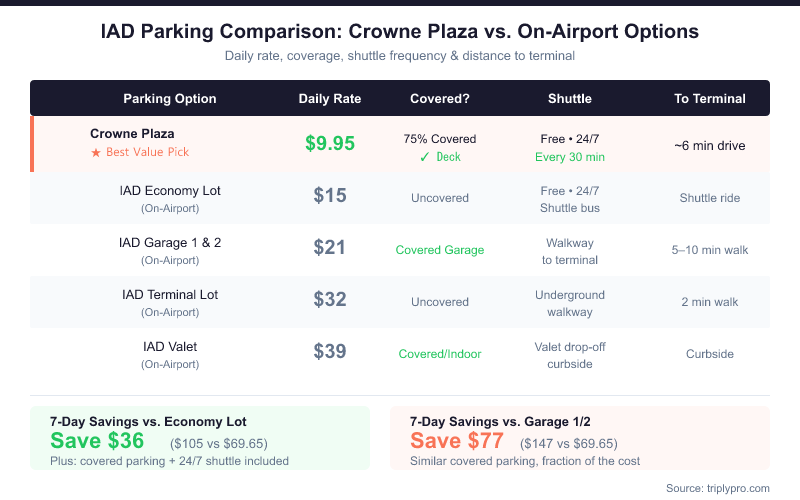 To put that in context: on-airport IAD parking at Garage 1 or 2 costs $21/day, the Terminal Lot costs $32/day, and Valet runs $39/day. At $9.95/day, the Crowne Plaza lot saves you over 50% compared to IAD's garages and up to 69% compared to the Terminal Lot.
