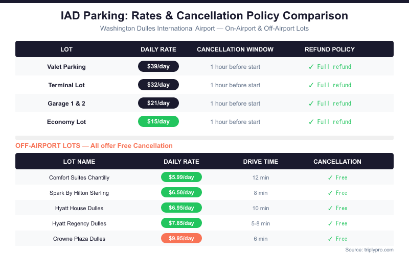The clearest way to avoid any cancellation risk at Washington Dulles International Airport is to book an off-airport lot with free cancellation. Rates start at $5.99/day at Comfort Suites Chantilly — that's over 60% less than the on-airport Economy Lot at $15/day, and every listed option includes a free shuttle to the terminal. For a complete overview of every IAD parking option, the hub guide covers on-airport and off-airport choices side by side.